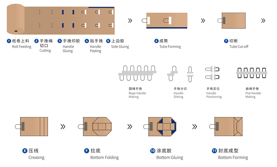 该机器用于生产带手挽的手提纸袋,由手挽工位将原材料自动做成手挽,通过输送系统将做好的手挽传送给切把、送把、贴把、压把的工位,然后将原色或印刷好的卷筒纸进行贴片位点断、贴片位涂胶、自动粘贴手挽,再由主机将贴有手挽的纸张进行涂边胶、成筒、切断、压痕、底部涂胶、袋底成形并输送出袋,整个过程一次性同步完成。真正实现了全自动化生产,能够有效地节省人工成本。